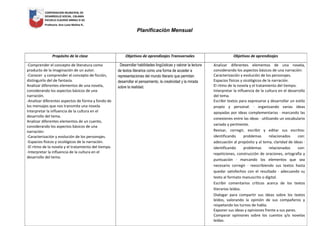 Este documento presenta la planificación mensual de una profesora para la asignatura de Lenguaje y Comunicación. Incluye los objetivos de aprendizaje como comprender la literatura y distinguir ficción de fantasía, analizar elementos de novelas y cuentos, y desarrollar habilidades de escritura y expresión oral. También presenta ejemplos de actividades como lectura y análisis de fragmentos literarios, y exposiciones de los estudiantes sobre sus lecturas.