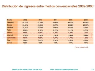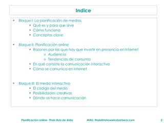 El documento presenta un plan de capacitación sobre planificación de medios y nuevos medios que consta de siete bloques. El primer bloque explica conceptos clave de planificación de medios como cobertura y afinidad. El segundo bloque argumenta que Internet debe ser un medio prioritario debido a su creciente audiencia y tendencias de consumo. El tercer bloque describe la comunicación interactiva en Internet y formatos publicitarios.