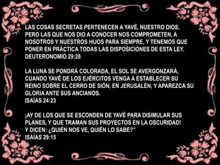 El documento contiene varios pasajes bíblicos que hacen referencia a cosas ocultas, secretas o misteriosas que solo Dios conoce, como el día del juicio final, así como la necesidad de estar preparados porque la venida de Cristo será repentina e inesperada. También se mencionan pasajes sobre revelar secretos y confesar faltas.