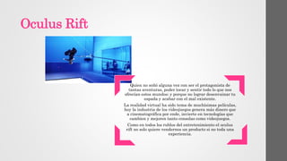 El documento habla sobre el dispositivo Oculus Rift y la realidad virtual. Oculus Rift es un casco de realidad virtual que ofrece una amplia visión de campo, baja latencia y capacidad de seguir los movimientos de la cabeza para brindar una experiencia inmersiva. Genera imágenes 3D estereoscópicas con profundidad y escala mediante la presentación de imágenes separadas para cada ojo. El lanzamiento del producto se retrasó hasta mediados de 2015.