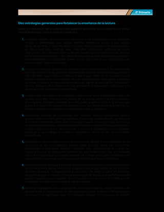 Este documento presenta una serie de estrategias didácticas para fortalecer la enseñanza de la lectura en estudiantes de segundo grado de primaria. Se enumeran diez aspectos generales para crear un ambiente de aprendizaje letrado y se proporcionan múltiples estrategias como lectura en voz alta por el maestro, tiempo para lectura libre, fortalecimiento del conocimiento previo, y modelado de habilidades de pensamiento. El objetivo es apoyar el desarrollo de habilidades de comprensión lectora a