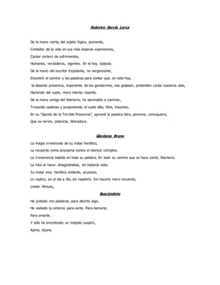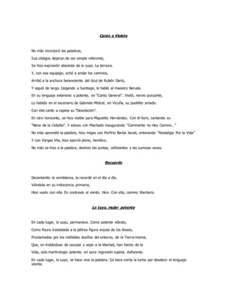 Este poema rinde homenaje a la poeta chilena Violeta Parra a través de 3 oraciones: