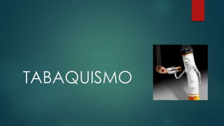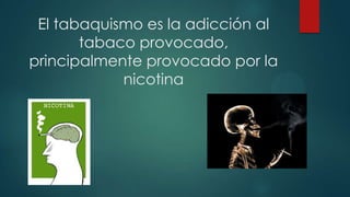 El tabaquismo es una adicción al tabaco causada principalmente por la nicotina, que causa más de 50,000 muertes al año en México. Existen dos tipos de fumadores, los activos y los pasivos, y el tabaquismo en jóvenes a menudo se ve influenciado por factores sociales o por el ejemplo de sus padres.