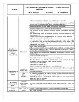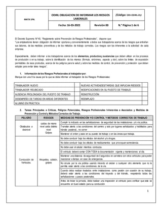Este documento establece la obligación de informar a los trabajadores sobre los riesgos laborales inherentes a su puesto de trabajo y las medidas de prevención correspondientes. Se identifican los principales peligros y riesgos asociados a tareas como la conducción de vehículos, la carga física y el manejo de equipos, así como los agentes físicos, químicos y biológicos presentes. También se indican las medidas generales ante emergencias y se prohíben ciertas conductas que puedan comprometer la seguridad o salud