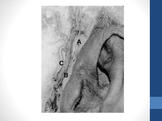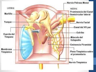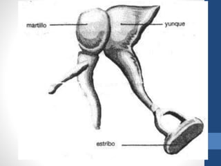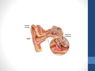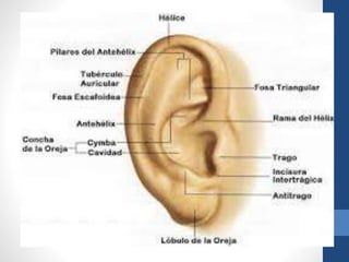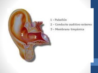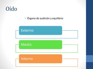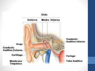 Este documento describe la anatomía del oído. El oído está dividido en tres secciones: externo, medio e interno. El oído externo incluye la oreja y el conducto auditivo externo. El oído medio contiene los huesecillos del oído y la trompa de Eustaquio. El oído interno aloja el órgano del equilibrio y la audición en estructuras óseas y membranosas.