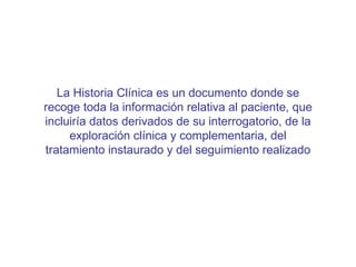 La historia clínica en odontología incluye la recopilación de datos del paciente a través de una anamnesis y exploración clínica, así como exploraciones complementarias como radiografías. La anamnesis recoge datos personales y médicos del paciente, mientras que la exploración clínica evalúa la boca mediante inspección, palpación y auscultación. Los hallazgos se registran en un odontograma, identificando cada diente con un número. Las radiografías como las periapicales y panorámicas permit