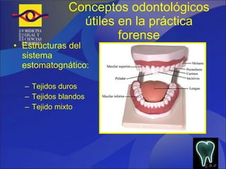 El documento presenta conceptos odontológicos útiles en la práctica forense. Explica las estructuras del sistema estomatognático como tejidos duros, blandos y mixtos. Describe superficies dentales, división dental por tercios y nomenclatura. Detalla aplicaciones como identificación dental ante y post-mortem, estudio de edad y sexo, identificación de huellas de mordedura. Explica técnicas como autopsia oral, disección facial, establecimiento de edad y sexo, y comparaciones de ADN.