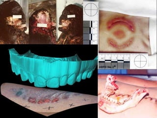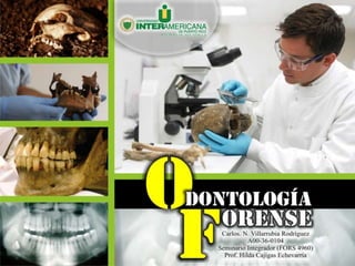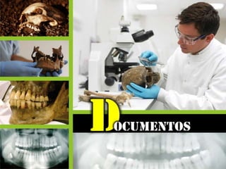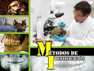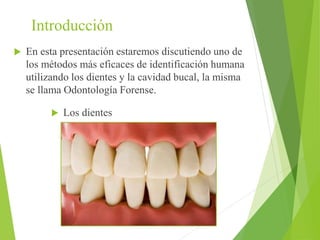 Este documento discute el método de identificación humana de odontología forense. La odontología forense es la aplicación de conocimientos odontológicos para identificar personas mediante el análisis de sus dientes y boca. Los datos dentales registrados antes de la muerte se comparan con los datos dentales post mortem para establecer una identidad. Los dientes y sus características son útiles para la identificación debido a que son estructuras que resisten el tiempo y los traumas.
