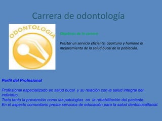La carrera de odontología se enfoca en prestar servicios de salud bucal a la población a través de la prevención, diagnóstico y tratamiento de enfermedades bucodentales. Los profesionales de odontología evalúan la salud bucal y general de los pacientes, aplican técnicas como fluoruros y sellados para corregir problemas, y también realizan cirugías y extracciones. Además, desarrollan campañas de educación sobre salud bucal y proveen asistencia dental a grupos de población. La