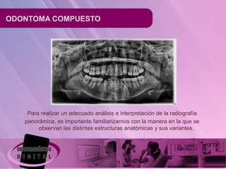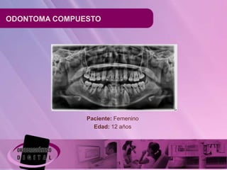 Este documento describe un caso de odontoma compuesto en una paciente femenina de 12 años. La radiografía panorámica muestra múltiples imágenes radiopacas de densidad dentaria que están impactando el diente 33. Los odontomas son los tumores odontogénicos más comunes y a menudo se detectan radiográficamente en la segunda década de vida, siendo su ubicación más frecuente en el maxilar superior en la zona anterior.