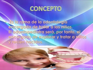 Este documento describe diferentes temas relacionados con la odontopediatría. Habla sobre el tratamiento de niños y recién nacidos por odontopediatras y sobre procedimientos como el recubrimiento indirecto y las pulpectomías y pulpotomías. También menciona materiales temporales y definitivos usados en obturaciones e incluye algunas características y causas de tratamientos odontológicos.