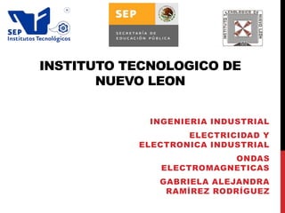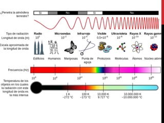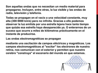 Este documento describe las características fundamentales de las ondas electromagnéticas. Explica que se propagan a través de oscilaciones de los campos eléctrico y magnético a una velocidad constante de 300,000 km/s. También describe las propiedades clave como la frecuencia, longitud de onda, amplitud y cómo estas propiedades están relacionadas entre sí a través de ecuaciones matemáticas. Finalmente, introduce el concepto de espectro electromagnético para clasificar las diferentes ondas según su frecuencia.