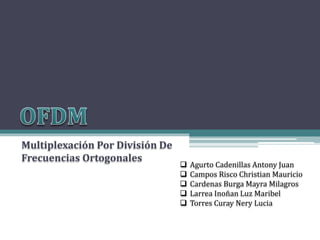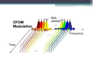 El documento presenta la multiplexación por división de frecuencias ortogonales (OFDM), un esquema de modulación digital que divide el espectro en sub-canales ortogonales para mejorar la eficiencia del ancho de banda y combatir el ruido en las comunicaciones. Se describen los principios de la modulación, así como las ventajas y desventajas de OFDM y su aplicación en diversas tecnologías de transmisión digital. Además, aborda aspectos técnicos como el uso de transformadas de Fourier y códigos de corrección de errores para optimizar la transmisión de datos.