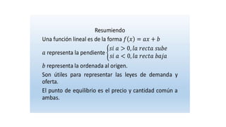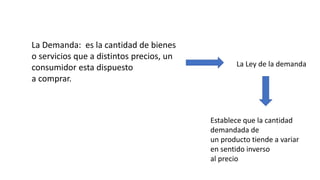 Este documento describe los conceptos básicos de oferta y demanda. Explica que la demanda es la cantidad de bienes que los consumidores están dispuestos a comprar a diferentes precios, y que la cantidad demandada tiende a disminuir a medida que aumentan los precios. Identifica variables como los gustos, el tamaño de la población y los ingresos que afectan la curva de demanda. Por otro lado, la oferta es la cantidad que los productores están dispuestos a ofrecer y tiende a aumentar con los precios. Variables como los costos de producción