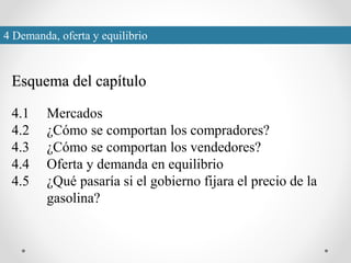 Este documento presenta un capítulo sobre demanda, oferta y equilibrio. Explica conceptos clave como curvas de demanda y oferta, equilibrio competitivo, y los efectos de cambios en la demanda y la oferta. También analiza cómo los compradores y vendedores determinan los precios, y las consecuencias de fijar precios como el de la gasolina.