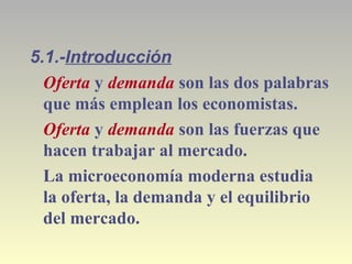 Este documento presenta conceptos clave sobre oferta y demanda. Explica que la oferta y la demanda son fuerzas que hacen funcionar al mercado, determinadas por los compradores y vendedores respectivamente. Define demanda como la cantidad de un bien que los compradores están dispuestos y son capaces de comprar, y oferta como la cantidad que los vendedores están dispuestos y son capaces de vender. Describe las leyes de la oferta y la demanda, y factores que afectan ambas como el precio, ingresos, y precios de bienes relacionados
