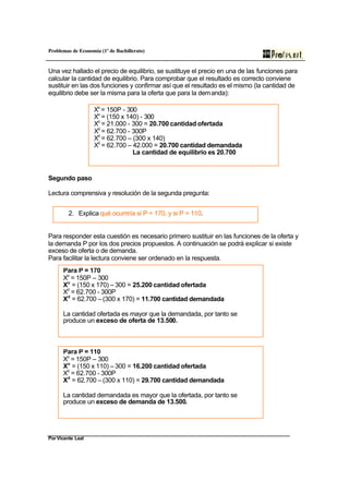 Este documento presenta un problema de economía sobre oferta y demanda. Se dan las funciones de oferta y demanda y se pide calcular el precio y cantidad de equilibrio, analizar qué ocurre a otros precios, y graficar la situación. El precio de equilibrio es 140 unidades monetarias y la cantidad de equilibrio es 20.700. A 170 unidades monetarias hay exceso de oferta y a 110 unidades monetarias hay exceso de demanda.