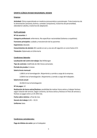 La clínica en Bad Wildungen, Alemania ofrece 5 puestos de enfermería con contrato indefinido. Los requisitos incluyen titulación de enfermería y nivel B2 de alemán. El salario es de 1.000 euros al mes sin homologación o 2.038 euros con homologación. La clínica proporciona alojamiento durante los primeros dos meses y asistencia con trámites legales.