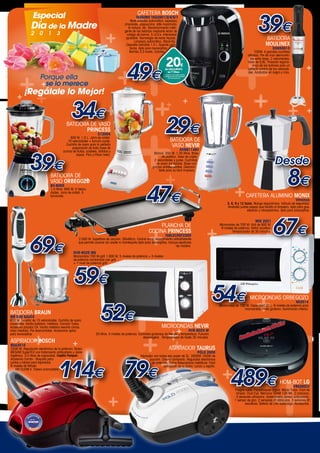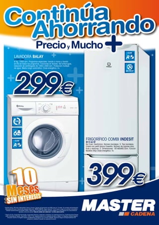 Este documento contiene anuncios publicitarios de varios electrodomésticos y sus especificaciones técnicas, incluyendo una lavadora Balay de 6 kg y clase energética A+, un refrigerador combinado Indesit No Frost de 187 cm de alto con 3 bandejas de cristal y 2 cajones para fruta, una cafetera Tassimo automática para diferentes bebidas con reconocimiento de códigos de barras y depósito extraíble de 1.5 litros, y una batidora Moulinex de 700W con 4 cuchillas y vaso de