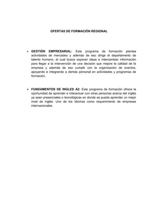 Este documento presenta dos programas de formación regional. El primer programa se enfoca en la gestión empresarial y cubre actividades de mercadeo, talento humano e intervención de decisiones para mejorar la calidad de la empresa. El segundo programa ofrece fundamentos de inglés de nivel A2 para aprender e interactuar sobre el idioma inglés a través de medios presenciales y tecnológicos.
