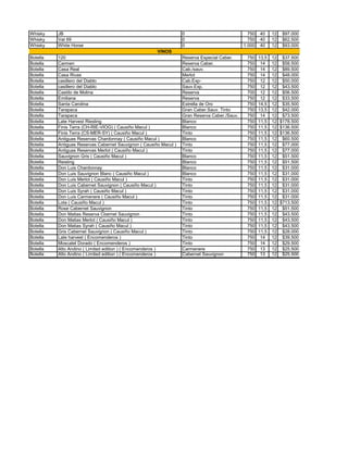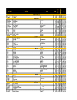 El documento presenta un amplio catálogo de bebidas alcohólicas, incluyendo cervezas, piscos, rones, vodkas, whiskies y vinos, junto con sus precios y características. Cada producto está detallado por marca, tipo, volumen y contenido alcohólico en un formato tabular. Los precios varían significativamente, lo que sugiere una gama diversa para diferentes preferencias y presupuestos.