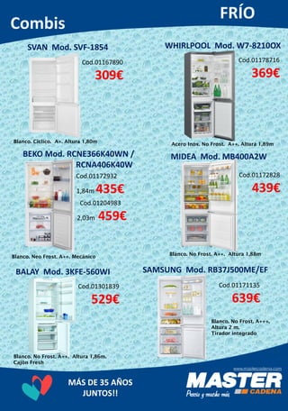 Este documento contiene una lista de electrodomésticos y aparatos de calefacción con sus códigos, precios y especificaciones técnicas. Incluye neveras, lavadoras, secadoras, calentadores, purificadores de aire y más. Los precios van desde 10€ a 729€. La mayoría son marcas conocidas como Balay, Samsung, Siemens, Bosch e Indesit.