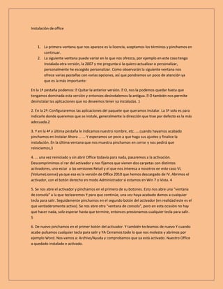 Este documento proporciona instrucciones para instalar y activar Microsoft Office 2010. Explica 1) seleccionar las aplicaciones a instalar durante el proceso de instalación, 2) configurar las aplicaciones deseadas en la segunda pestaña, y 3) indicar la ubicación de instalación en la tercera pestaña. Luego describe ejecutar un activador para completar la activación de Office 2010 después de reiniciar el equipo.