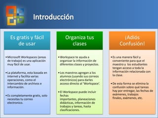 El documento es una guía para utilizar Office Live Workspace destinada a profesores y estudiantes, que detalla los pasos para crear un área de trabajo para cada materia. Se enfatiza la importancia de personalizar la descripción del área y de gestionar adecuadamente los permisos de los estudiantes, ya sea como editores o lectores. Además, se ofrece soporte adicional por parte de Artotems Co. para resolver dudas.
