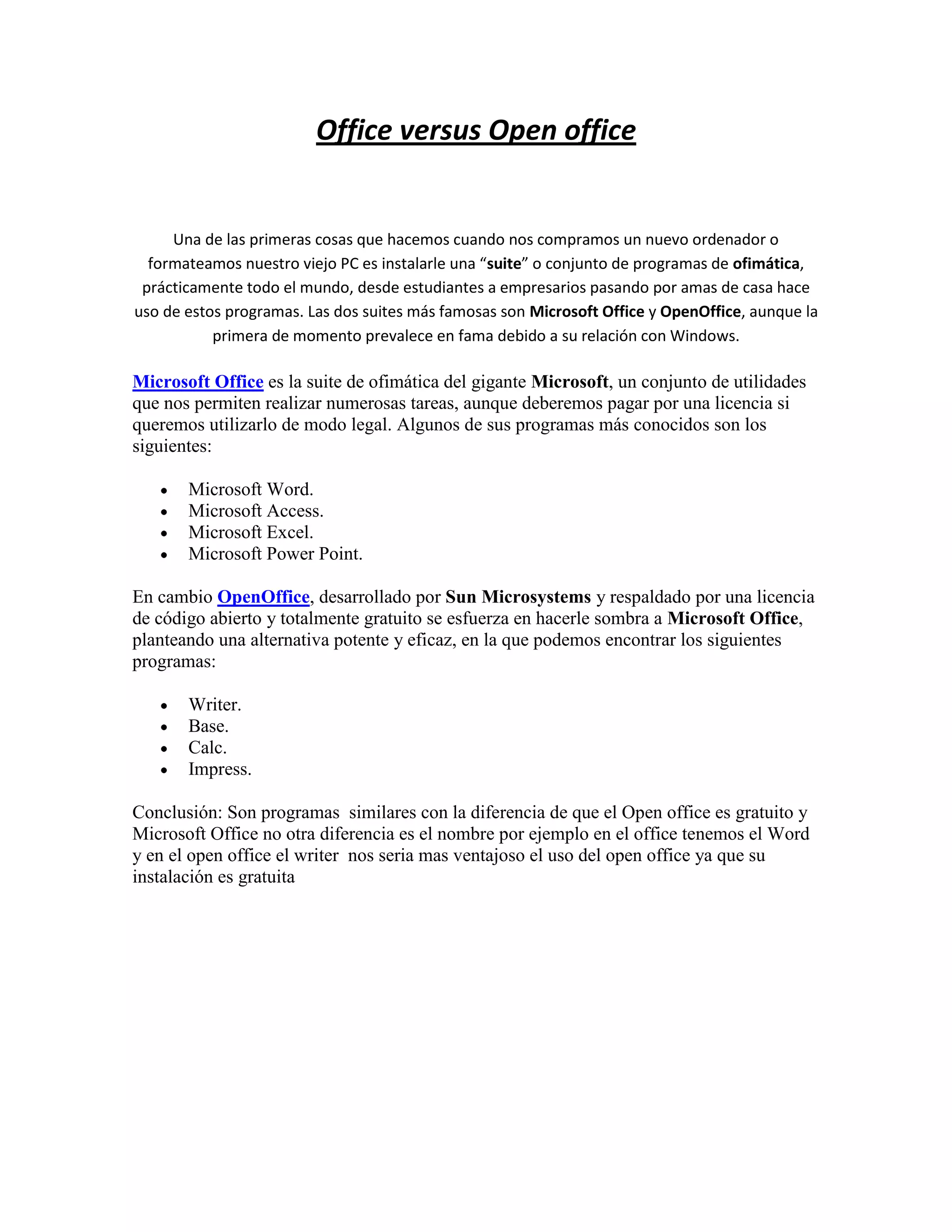 Este documento compara las suites de ofimática Microsoft Office y OpenOffice, destacando que mientras Office es de pago, OpenOffice es de código abierto y gratuito. Ambas ofrecen programas similares como procesadores de texto, hojas de cálculo y presentaciones, aunque con nombres diferentes. El documento concluye que OpenOffice sería más ventajoso de usar debido a que es gratuito.
