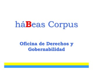 Habeas Corpus es una oficina privada de consultoría en derechos y gobernabilidad, compuesta por profesionales del derecho que operan de manera civil, imparcial e independiente. Su misión es fortalecer las garantías de derechos y contribuir al desarrollo de una gobernabilidad democrática. También se aborda el concepto histórico del recurso de habeas corpus como una reivindicación del derecho a la libertad y un freno a la arbitrariedad.