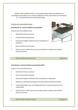 Este documento presenta una propuesta de oficina virtual en el parque empresarial SANT CUGAT BUSINESS PARK. Detalla los servicios incluidos en dos paquetes de oficina virtual, uno sin atención telefónica personalizada por 70,40€ al mes y otro con atención telefónica personalizada por 145,60€ al mes. También enumera costes variables adicionales y la documentación requerida para formalizar un contrato.
