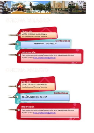 El documento proporciona información de contacto de las oficinas centrales y sucursales de Trans Cevallos en los cantones de Cevallos, Babahoyo, Milagro y Ambato, incluyendo direcciones, teléfonos y correo electrónico para enviar comentarios o sugerencias.