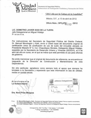 Copia del documento original de certificación único de zonificación de uso de suelo del inmueble ubicado en Presidente Mazarik N° 8, Col. Chapultepec Morales, Delegación Miguel Hidalgo, expedido por la Secretaría de Desarrollo Urbano y Vivienda