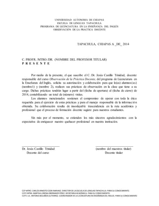 El documento es una solicitud de un profesor a un maestro titular para que permita que dos estudiantes realicen observaciones de clase como parte de su práctica docente. El profesor pide permiso para que los estudiantes observen las clases del maestro titular entre las fechas especificadas. El profesor asegura que los estudiantes operarán de manera ética y responsable durante las observaciones.