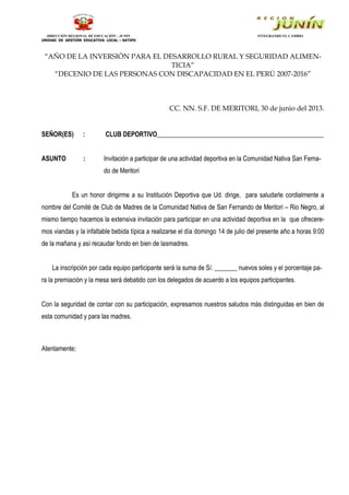 El documento es una invitación dirigida a clubes deportivos para participar en una actividad deportiva en la Comunidad Nativa San Fernando de Meritori el 30 de junio. El objetivo es recaudar fondos para la Institución Educativa a través de la venta de viandas y bebidas durante el evento deportivo. Se solicita a los clubes su inscripción con una cuota y se debatirá el porcentaje de premiación según la cantidad de equipos participantes.