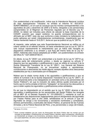 Este documento resume la posición de la Superintendencia Nacional de Administración Tributaria sobre si los aguinaldos y gratificaciones de los pensionistas del Decreto Ley N°20530 están exentos del pago de la Contribución Solidaria de Asistencia Previsional (COSAP) desde la vigencia de la Ley N°29351 o a partir de la Ley N°29714. La SUNAT ratifica que dichos pagos están exentos desde la Ley N°29351 según una interpretación sistemática y coherente con disposiciones anteriores y posteriores.