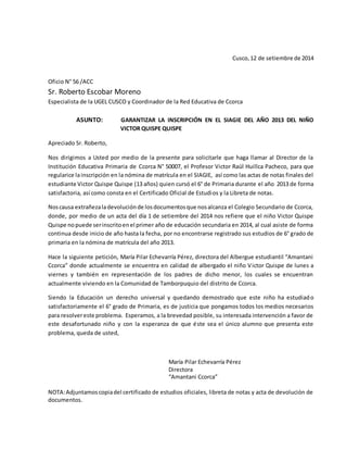 La directora del Albergue estudiantil "Amantani Ccorca" le escribe al coordinador de la Red Educativa de Ccorca para solicitar que se garantice la inscripción en el SIAGIE del año 2013 del estudiante Victor Quispe Quispe, quien cursó satisfactoriamente el 6° grado de primaria. El colegio secundario devolvió los documentos del estudiante indicando que no estaba registrado en el SIAGIE del 2013. Se pide intervenir a favor del estudiante para que pueda inscribirse en primer año de sec