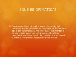 El documento describe las herramientas de ofimática, que son conjuntos de técnicas e instrumentos informáticos utilizados para optimizar las tareas de una oficina. Entre las herramientas se incluyen procesadores de texto, hojas de cálculo, presentaciones multimedia, bases de datos y programas de correo electrónico. También existen suites ofimáticas que integran múltiples herramientas, así como herramientas en la web, de imagen y video, y de localización. Las herramientas permiten crear, compartir y editar document