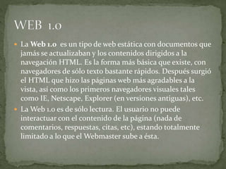 La Web 1.0 es estática y de sólo lectura, la Web 2.0 permite interacción entre usuarios y edición de contenido, y la Web 3.0 se centra en hacer que los contenidos sean accesibles a través de múltiples aplicaciones y el uso de inteligencia artificial.