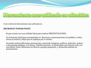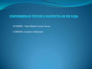 Talía Mishel Loaiza Torres es una estudiante de Gestión Ambiental que cree que Microsoft Power Point es la herramienta más útil para realizar presentaciones debido a que permite insertar animaciones, imágenes, gráficos y otros medios, y compartir la presentación de manera fácil con audiencias en vivo o a distancia.