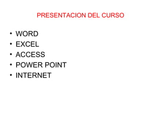 Este documento presenta un curso de ofimática que incluye clases sobre Word, Excel, Access, Power Point e Internet. Excel se utiliza para crear tablas y gráficos, y el documento se despide hasta pronto.