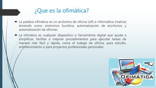 La ofimática se refiere a las herramientas digitales que ayudan a simplificar y mejorar el trabajo de oficina, como la creación y edición de documentos, hojas de cálculo, presentaciones y almacenamiento de archivos. Algunos de los principales programas de ofimática utilizados en las empresas son Word, Excel, PowerPoint, Outlook y Access. La ofimática automatiza las tareas de oficina y permite modificar y compartir documentos en tiempo real entre varios usuarios.