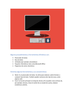 La ofimática se refiere a las herramientas informáticas utilizadas para automatizar y mejorar los procesos de una oficina, como procesadores de texto, hojas de cálculo y bases de datos. Algunas de las herramientas más comunes son Microsoft Office, Word para redactar documentos, Excel para hojas de cálculo, Access para bases de datos y PowerPoint para presentaciones. La ofimática tiene como objetivo optimizar las tareas de una oficina ahorrando tiempo y mejorando la eficiencia.