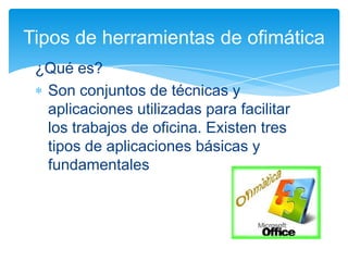 Este documento describe los tipos de herramientas de ofimática, incluyendo programas como Word, Excel, Access y PowerPoint. Estas herramientas se utilizan para optimizar tareas de oficina como la creación y edición de documentos, hojas de cálculo, bases de datos y presentaciones. Algunas ventajas son que son fáciles de usar y permiten compartir archivos, mientras que las desventajas incluyen la necesidad de conexión a Internet y un límite de peso en los documentos.