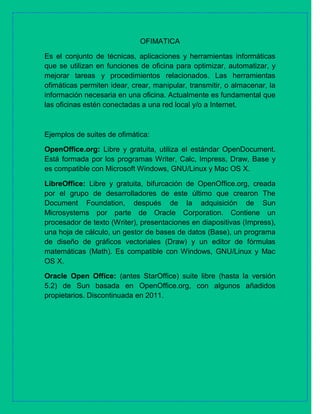 Ofimática se refiere al conjunto de técnicas y herramientas informáticas utilizadas en las oficinas para optimizar y automatizar tareas. Las suites de ofimática más populares son OpenOffice.org, LibreOffice y Oracle Open Office, las cuales incluyen programas como procesadores de texto, hojas de cálculo y presentaciones. Estas suites son compatibles con sistemas operativos como Windows, Linux y Mac OS X.