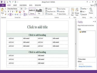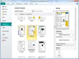 El documento proporciona una breve descripción de varias aplicaciones de Microsoft Office, incluyendo Microsoft Access, Excel, InfoPath, OneNote, Outlook, PowerPoint, Project, Publisher, SharePoint Workspace, Visio y Word. Se describen sus funciones principales y características.