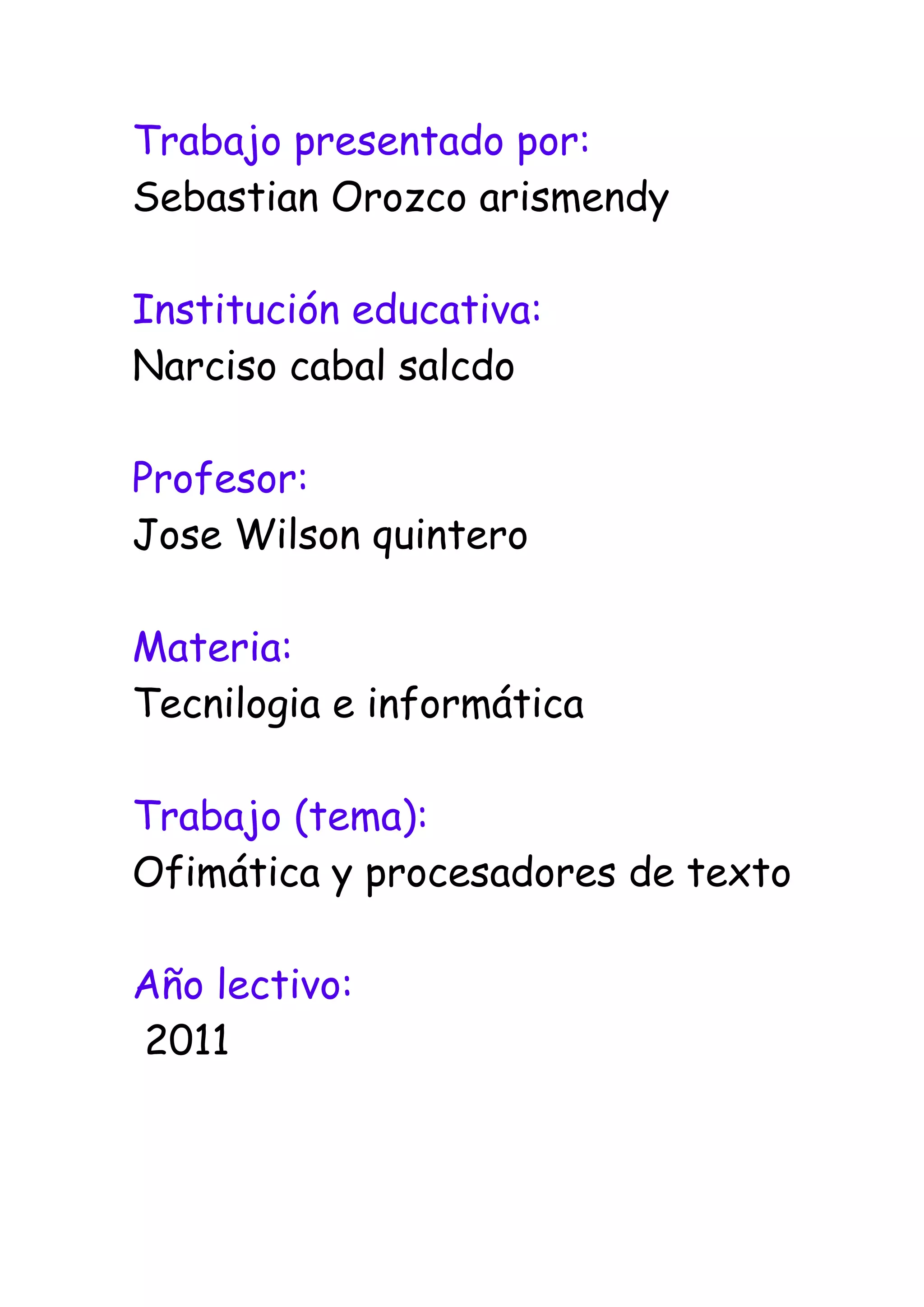 El documento habla sobre la ofimática y los procesadores de texto. Explica que la ofimática incluye aplicaciones y herramientas informáticas que se usan en oficinas para optimizar tareas como procesamiento de textos, hojas de cálculo, presentaciones multimedia, bases de datos y correo electrónico. También describe que los procesadores de texto permiten crear y modificar documentos en una computadora y ofrecen funciones como diferentes tipos de letra y correctores ortográficos. Luego menciona algunos de los procesadores de texto más utilizados