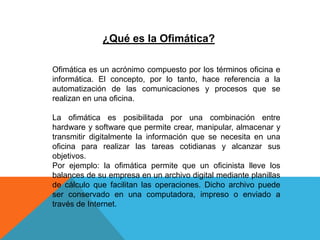 La ofimática permite la automatización de procesos y comunicaciones en una oficina mediante hardware y software. Esto incluye crear, almacenar, manipular e intercambiar información digitalmente para realizar tareas cotidianas como llevar balances financieros usando hojas de cálculo. La ofimática ha evolucionado desde máquinas de escribir y fotocopiadoras hasta computadoras personales e internet, lo que ha revolucionado la automatización de oficinas.