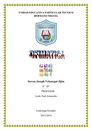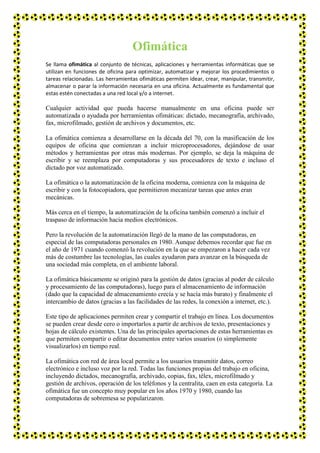 El documento habla sobre la ofimática. Explica que la ofimática incluye las técnicas y herramientas informáticas utilizadas en las oficinas para optimizar y automatizar tareas como el procesamiento de texto, hojas de cálculo, bases de datos y presentaciones. También describe los orígenes de la ofimática en la década de 1970 y cómo ha evolucionado con las computadoras personales y las redes. Finalmente, resume los paquetes ofimáticos más populares como Microsoft Office y OpenOffice, destacando sus características y programas
