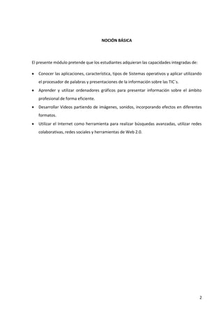 Este documento presenta el syllabus de un módulo formativo sobre NTICS I Ofimática impartido en la Universidad Técnica de Ambato. El módulo pretende que los estudiantes adquieran capacidades en el uso de sistemas operativos, procesadores de texto, presentaciones, herramientas gráficas, creación de videos y uso de Internet. El syllabus describe los contenidos, metodología, evaluación y materiales del módulo organizado en cuatro elementos de competencia.
